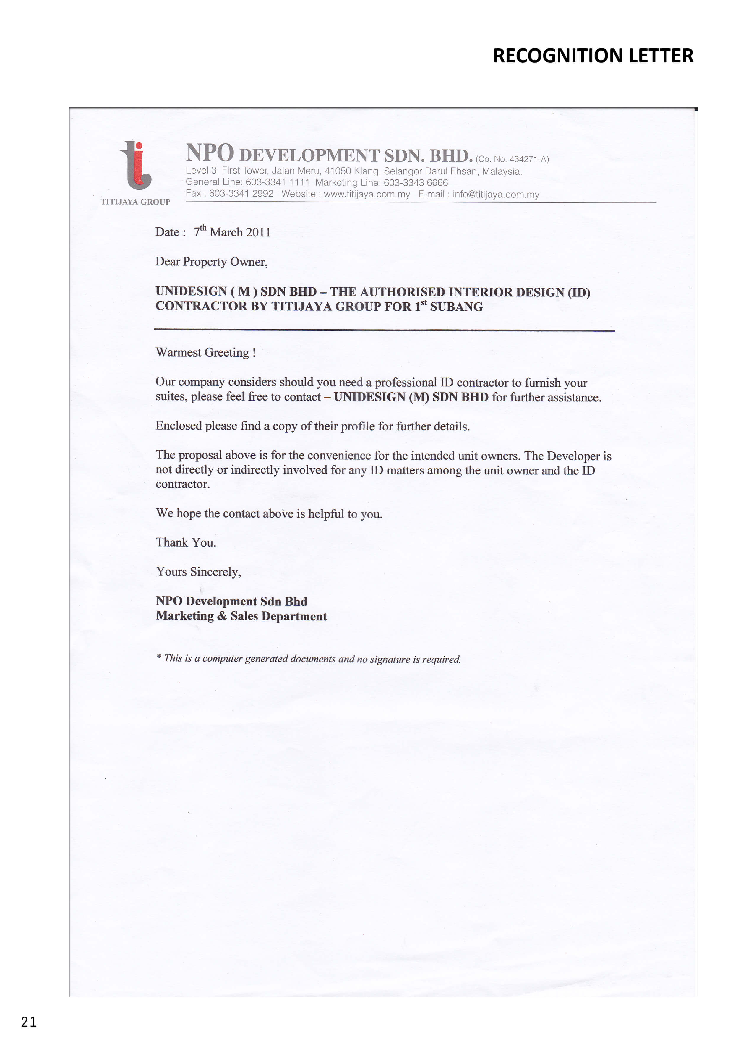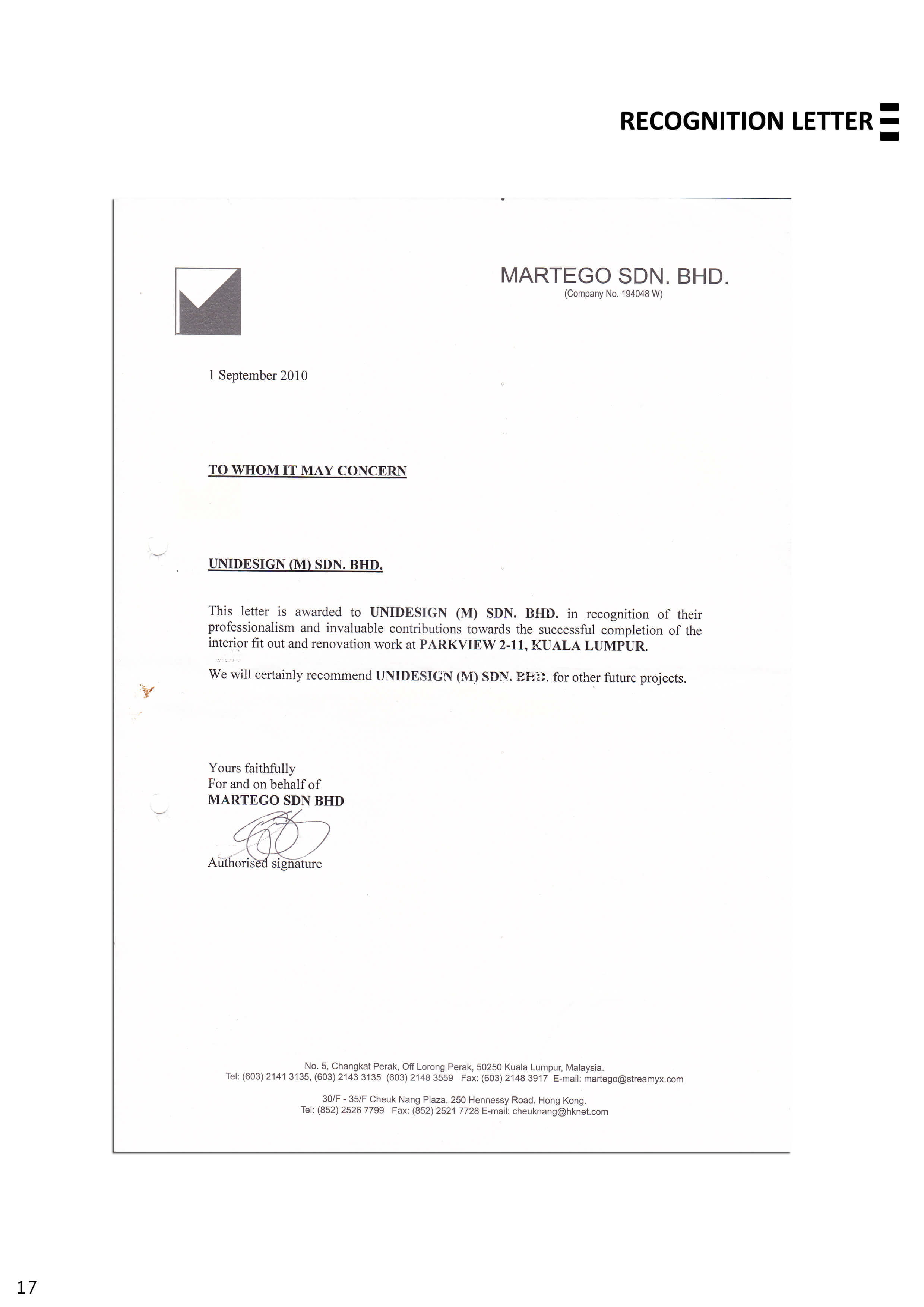 “we would like to put record that we are pleased with the quality of work and services rendered by Unidesign (M) Sdn Bhd they were very professional and responsible during the conduct of the renovation. “it it also our pleasure to recommend the services of Unidesign (M) Sdn Bhd to other organization who would require similar level of professional and work commitment.”